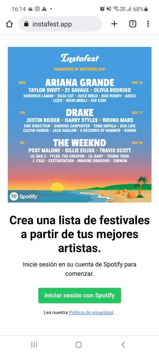 7 hours agoThe new Instafest tool generates your ultimate festival line-up by selecting your top artists based on your Spotify listening history from the last four weeks the last six months. 23 hours agoInstafest You can also hide your username before sharing if youre worried about randoms checking your account. Página de los premios más importantes a la creación del contenido digital de Latam.
